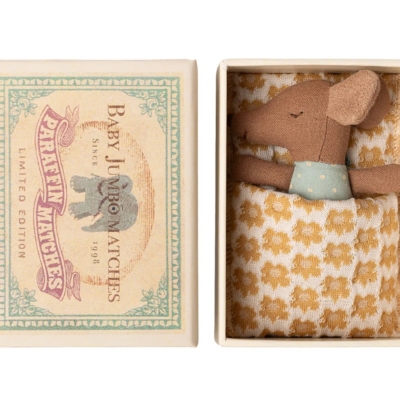Bebé ratón dormión en caja de cerillas. Azul