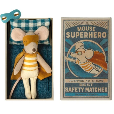 Ratón superhéroe en caja de cerillas
