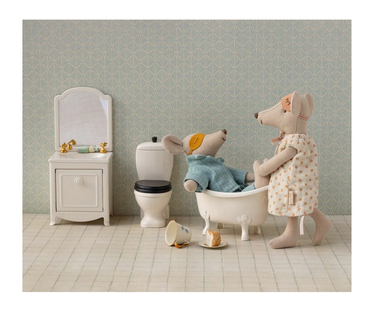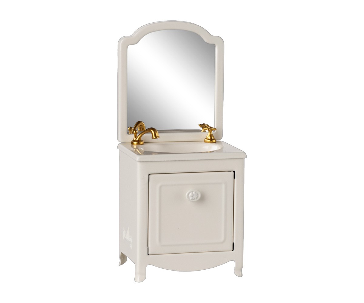 Un artículo imprescindible para el cuarto de baño de la Casa de Campo de los ratones. Cuenta con un pequeño armario debajo del lavabo y con un espejo.