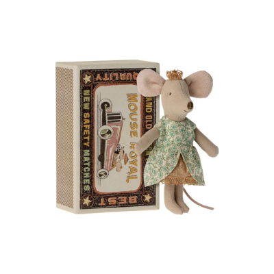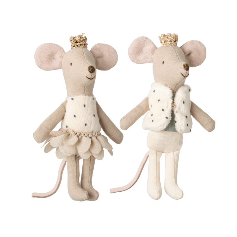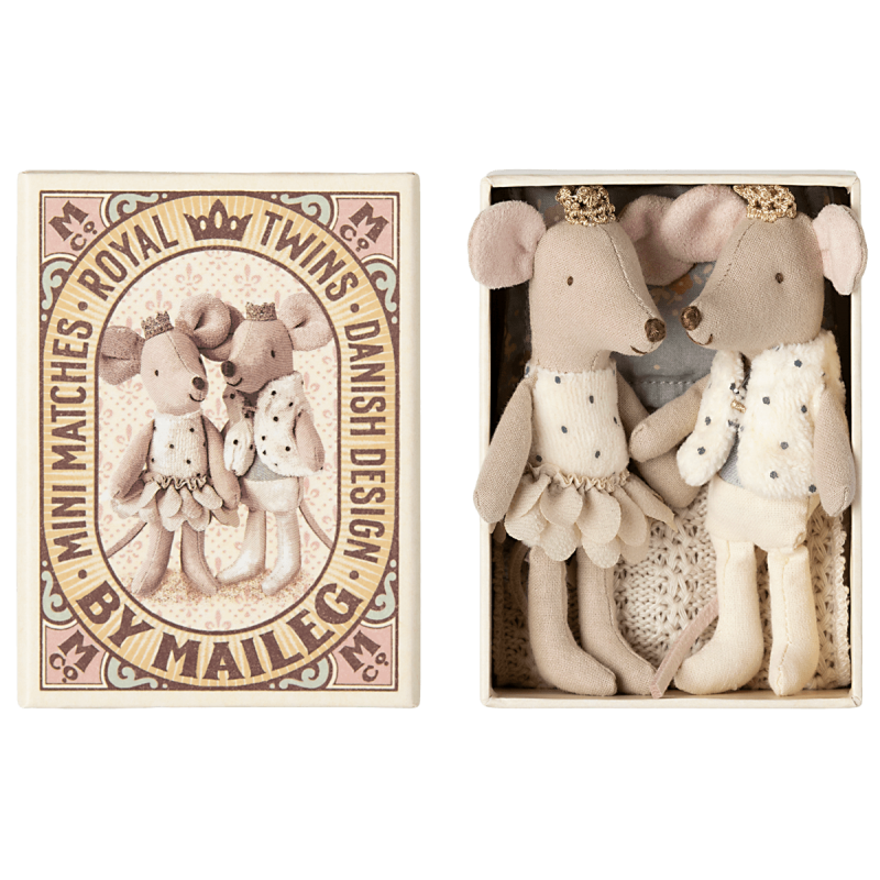 Los ratones gemelos reales compuestos por una pequeña princesa y un príncipe. Llevan coronas doradas y bonitos vestidos. Duermen en una caja de cerillas decorada con una foto suya en la parte delantera. Dentro de la caja viene la ropa de cama.